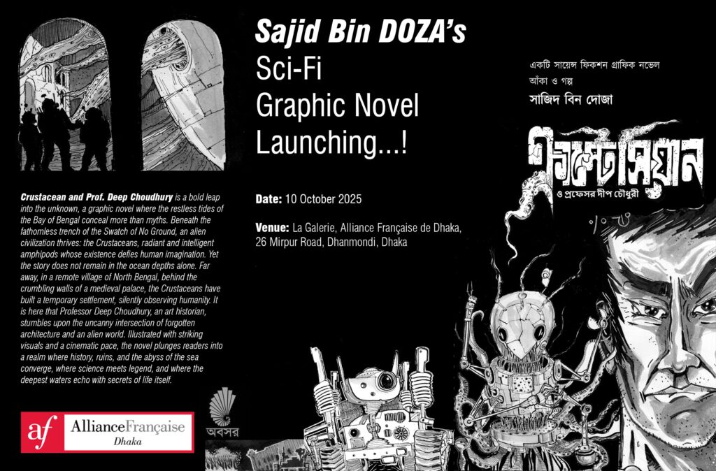 বাংলাদেশের প্রখ্যাত স্থপতি, শিল্পী ও গবেষক ড. সাজিদ বিন দোজা রচিত ও অঙ্কিত এক ব্যতিক্রমী সাই-ফাই গ্রাফিক নভেল ‘ক্রাস্টেসিয়ান ও প্রোফেসর দীপ চৌধুরী’–এর মোড়ক উন্মোচন অনুষ্ঠিত হতে যাচ্ছে ১০ অক্টোবর ২০২৫, শুক্রবার বিকেল ৫ টায়, আলিয়ঁস ফ্রঁসেজ দ্য ঢাকার লা গ্যালারিতে।