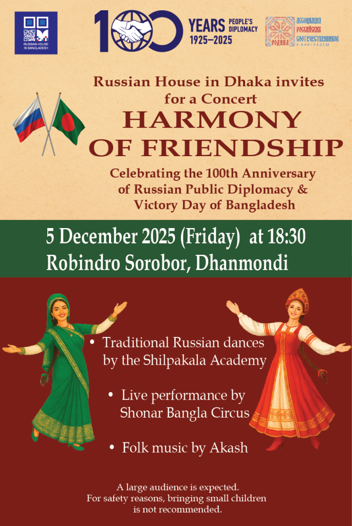 রুশ হাউস ঢাকার আয়োজনে রাশিয়ান জনকূটনীতির ১০০ বছর পূর্তি ও বাংলাদেশের বিজয় দিবস উদযাপন উপলক্ষ্যে ৫ ডিসেম্বর ২০২৫, শুক্রবার সন্ধ্যা ৬:৩০ মিনিটে ধানমন্ডির রবীন্দ্র সরোবর মঞ্চে ‘হারমনি অফ ফ্রেন্ডশিপ’.. শীর্ষক বর্ণাঢ্য সাংস্কৃতিক অনুষ্ঠান