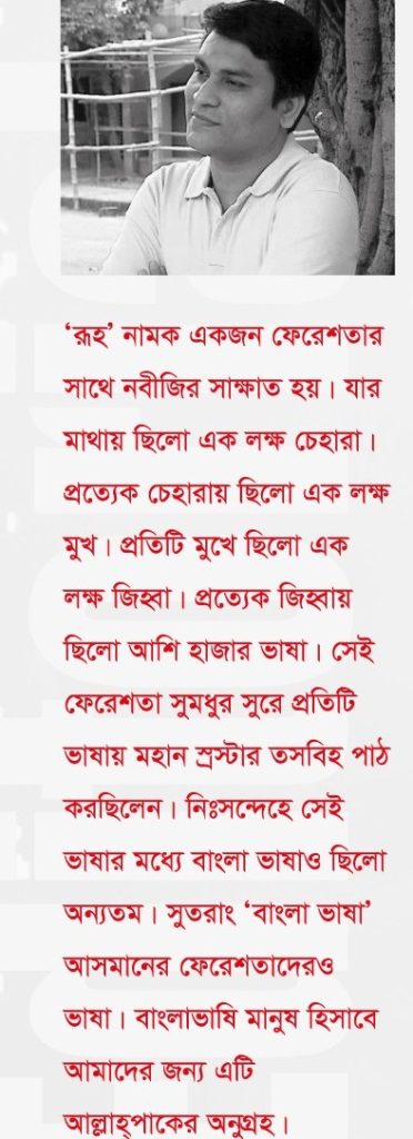 মানুষ এবং অন্যান্য প্রাণীকূলসহ মহাবিশ্বে ভাষা সংখ্যার একটি বিবরণ পাওয়া যায় নবী মোহাম্মদ স. এর মে’রাজ থেকে। সেখানে ‘রূহ’ নামক একজন ফেরেশতার সাথে নবীজির সাক্ষাত হয়। যার মাথায় ছিলো এক লক্ষ চেহারা। প্রত্যেক চেহারায় ছিলো এক লক্ষ মুখ। প্রতিটি মুখে ছিলো এক লক্ষ জিহ্বা। প্রত্যেক জিহবায় ছিলো আশি হাজার ভাষা। সেই ফেরেশতা সুমধুর সুরে প্রতিটি ভাষায় মহান স্রষ্টার তসবিহ পাঠ করছিলেন। নিঃসন্দেহে সেই ভাষার মধ্যে বাংলা ভাষাও ছিলো অন্যতম। সুতরাং ‘বাংলা ভাষা’ আসমানের ফেরেশতাদেরও ভাষা। বাংলাভাষি মানুষ হিসাবে আমাদের জন্য এটি আল্লাহ্পাকের অনুগ্রহ।